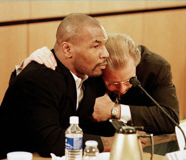 身穿黑色衣服的泰森坐在体委官员们面前放的一张桌子前作证,他的妻子陪伴在他的身旁。在医生们作证时,他聚精会神地盯着他们,偶而把头偏向他那当医生的妻子一边,耳语几句。