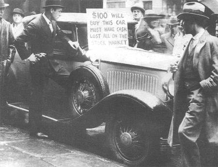 竖立在汽车上的牌子写道:“100美元可买下这辆轿车。在股市上丧秩了一切,急需现钞。”