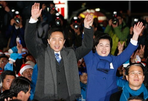 大国家党总统候选人李明博(左)与夫人和支持者们庆祝总统选举获