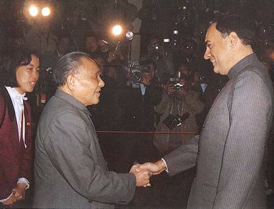 1988年12月19日至23日,印度总理拉吉夫·甘地对我国进行正式访问。这是34年来印度总理首次访问我国。李鹏总理和拉吉夫·甘地总理举行会谈。双方一致认为,在和平共处五项原则基础上恢复、改善和发展中印两国睦邻友好关系,是双方的共同愿望。双方同意通过和平友好方式协商解决边界问题。21日,邓小平在会见拉吉夫·甘地总理时说:当前世界上主要有两个问题,一个是和平问题,一个是发展问题。世界上现在有两件事情要同时做,一个是建立国际政治新秩序,一个是建立国际经济新秩序。中印两国共同倡导的和平共处五项原则是最经得住考验的。我们应当用和平共处五项原则作为指导国际关系的准则