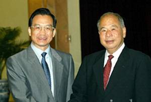 6月14日,中共中央政治局常委、书记处书记尉健行圆满结束对科特迪瓦、加蓬、博茨瓦纳和津巴布韦等非洲国家的访问回到北京。中共中央政治局委员、国务院副总理温家宝到人民大会堂迎接。新华社记者饶爱民摄