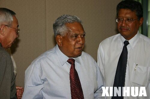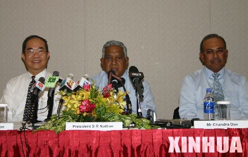 8月17日,已当选连任的新加坡现任总统纳丹(中)出席在新加坡举行的记者招待会。当天,在新加坡总统选举提名日,由于没有任何竞争对手,81岁的新加坡现任总统纳丹自动当选连任。 新华社记者张永兴摄