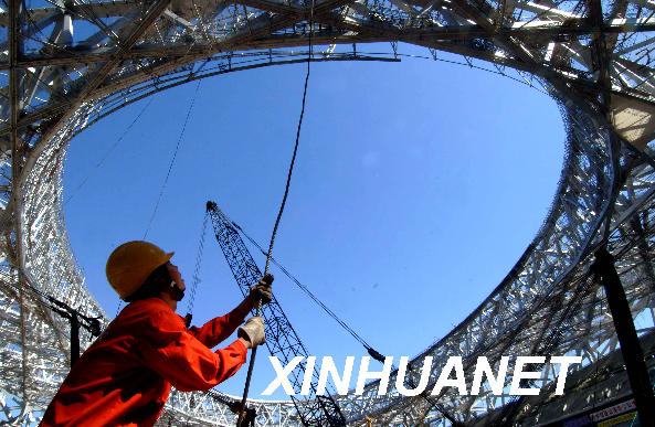 2007年5月1日,一位工人在国家体育场工地内指挥吊车作业。当日是五一国际劳动节,不少建设者用劳动和汗水庆祝自己的节日。五一节期间共有5300多名建设者坚守在2008年奥运会主场馆――国家体育场工地的各个岗位。新华社记者罗晓光摄