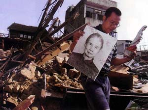 9月23日,一位男子从废墟中找回祖母的遗像和一尊观音像