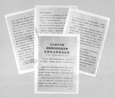 1971年8月中旬至9月12日,毛泽东到南方巡视。沿途与各省和各大军区领导谈话,暗示要解决林彪集团问题,图为毛泽东谈话的记录稿